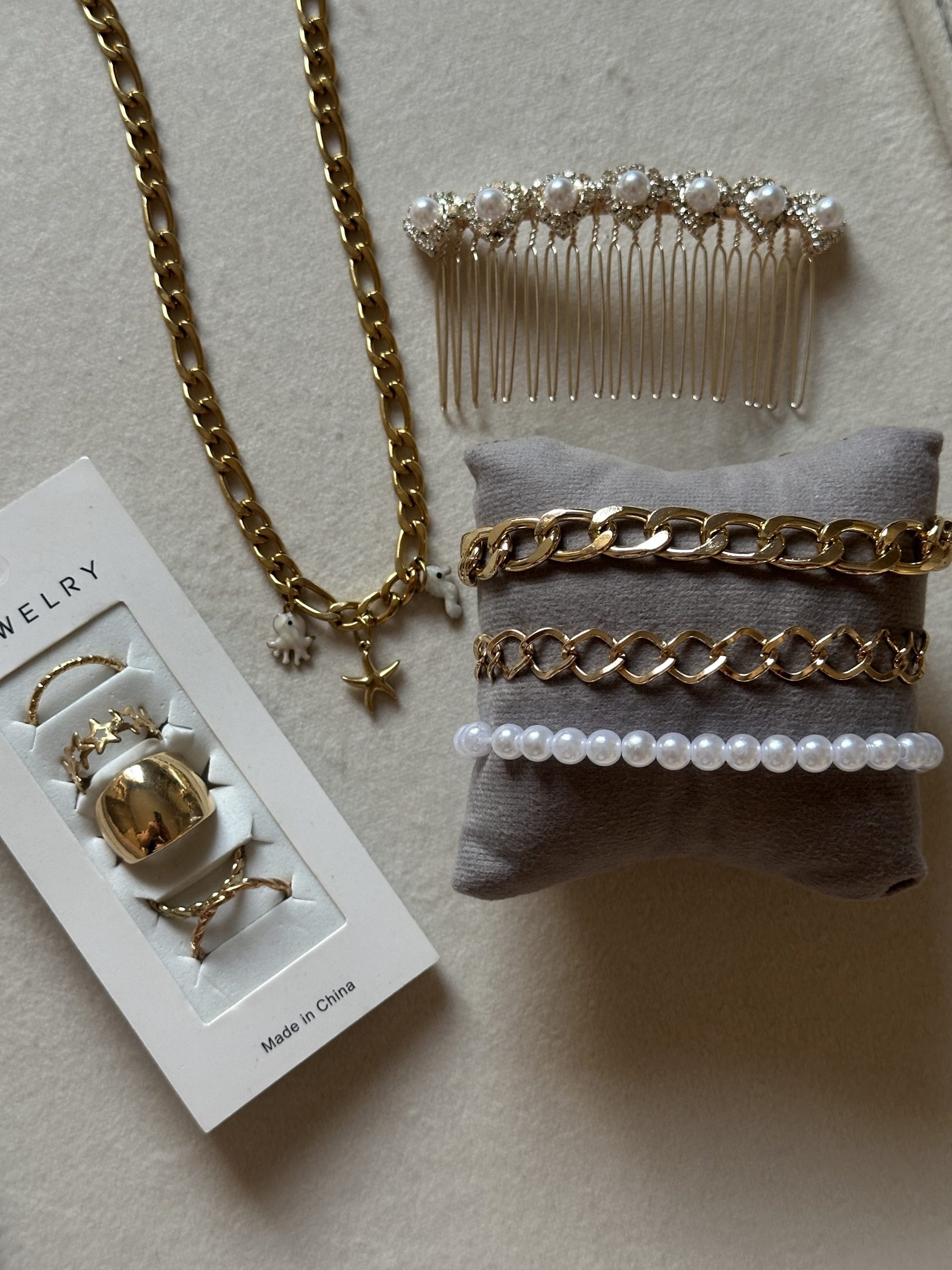 این پک شامل : گردنبند، پک انگشتر ۵ تایی، ۳ عدد دستبند، گلسر میباشد✔️